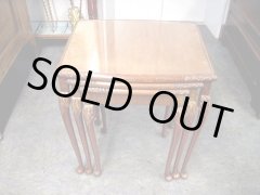 本体の角テーブルに四つの丸テーブルが収納されている実用的なネストテーブルです。