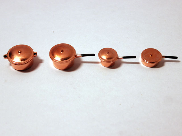 英国より直輸入 12分の1サイズのドールハウス・アクセサリーです。全体のサイズ 左から:w29 x Ф23 x h17mm、w40 x Ф23 x h17mm、w35 x Ф18 x h13mm、w33 x Ф18 x h10mm Pk 4 Asst. Copper Pots(w:幅、d:奥、Ф:径、h:高)