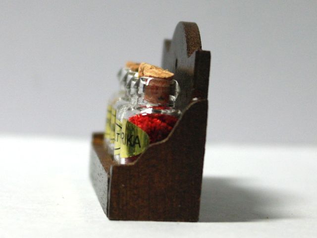 英国より直輸入 12分の1サイズのドールハウス・アクセサリーです。全体のサイズ:w55mm × d18mm x h37mm木製&ガラス製Wooden 4 Spice Jar Rack