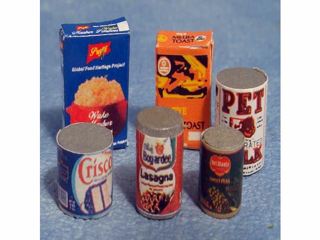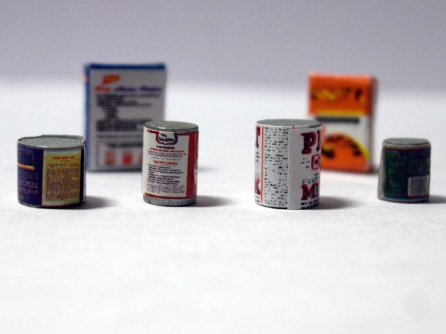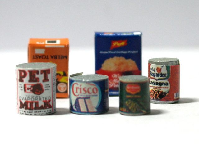 英国より直輸入 12分の1サイズのドールハウス・アクセサリーです。一番大きい箱(ブルー)のサイズ:13mm x d4mm x h17mmFood Tins & Packets