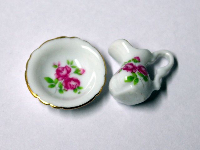 英国より直輸入 1/12サイズのドールハウス用品です。洗面器:Ф30 x h10mm,ジャグ:w25 x Ф18 x h28mmFloral Jug & Bowl Sm.(w:幅、d:奥、Ф:径、h:高)