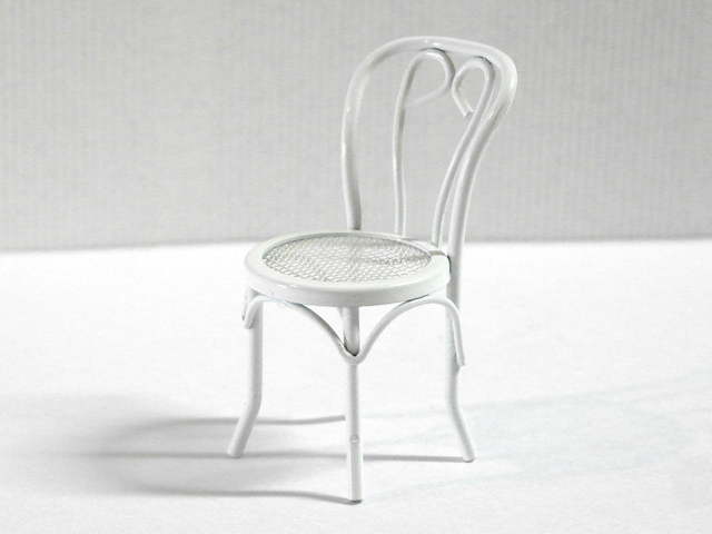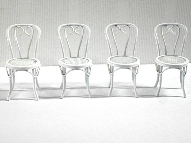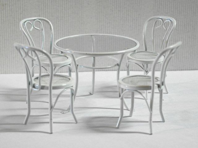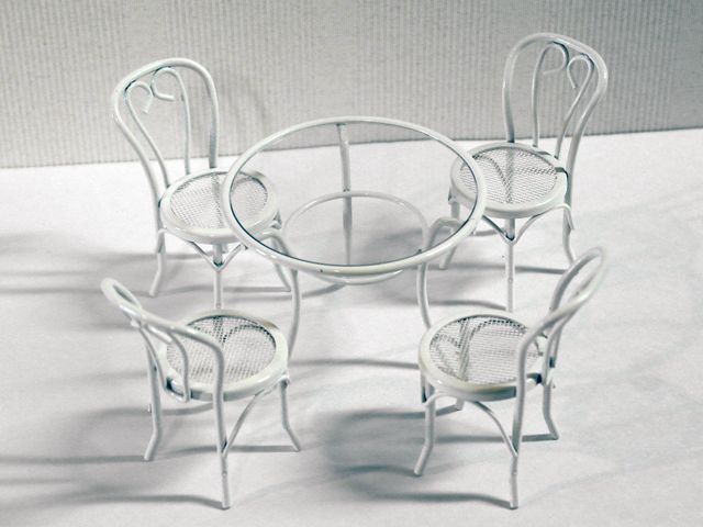 12分の1サイズのドールハウス商品です。PATIO TABLE & 4 CHAIRS/ WHITESet of Patio Table + 4 Chairs Table: 2.5" 6.3cmH. 3 1/4" 8.2cm Dia. Chair: 3 1/8"H. W4 x d5 x h8