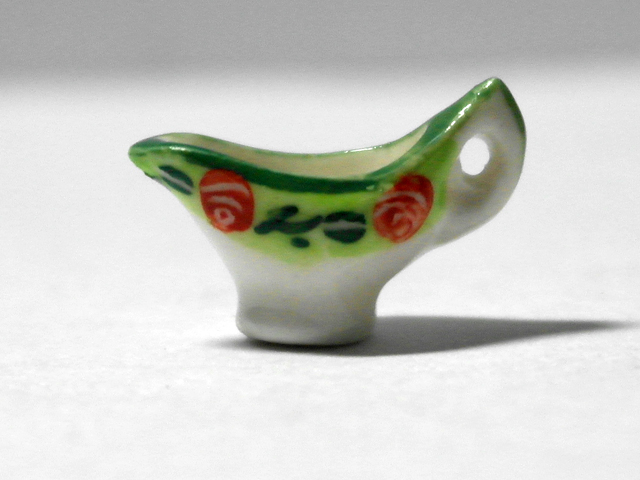英国より直輸入 12分の1サイズの ドールハウス・アクセサリーです。グレービー・ソース入れ:w22 x d11 x h16mm 陶器 Green Border(w:幅、d:奥、Ф:径、h:高)