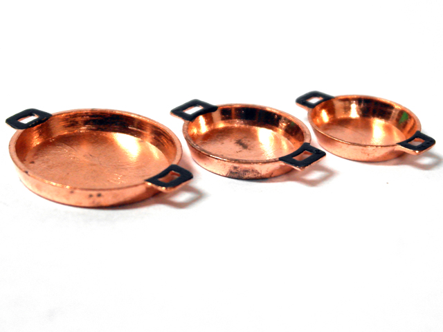 英国より直輸入 12分の1サイズのドールハウス・アクセサリーです。全体のサイズ:w41 x Ф32 x h5mm、w33 x Ф25 x h5mm、w31 x Ф22 x h5mm Set of 3 Copper Flat Pans(w:幅、d:奥、Ф:径、h:高)