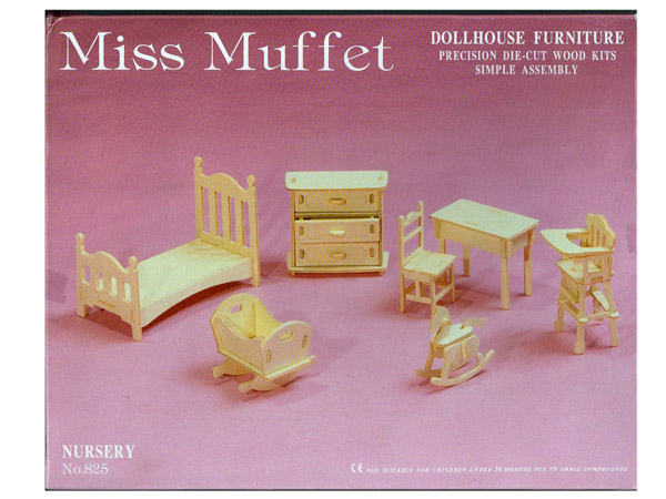 型抜き加工が施された木製キットで、簡単な組み立てでベビーベッド、ロッキングホース、ベビーチェアなど、7点の家具が完成します。Barewood Nursery Set( Miss Muffet dolls house set make your own. Precision die-cut wood kits simple assembly )