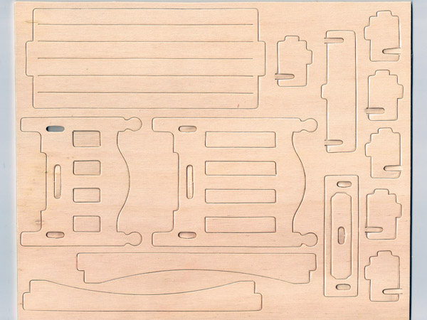 型抜き加工が施された木製キットで、簡単な組み立てでベビーベッド、ロッキングホース、ベビーチェアなど、7点の家具が完成します。