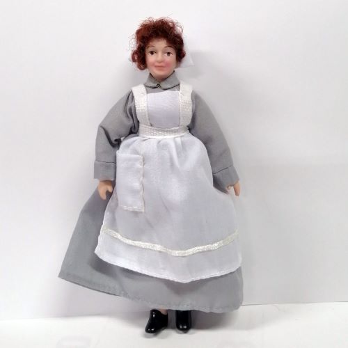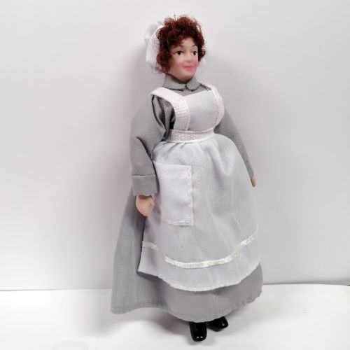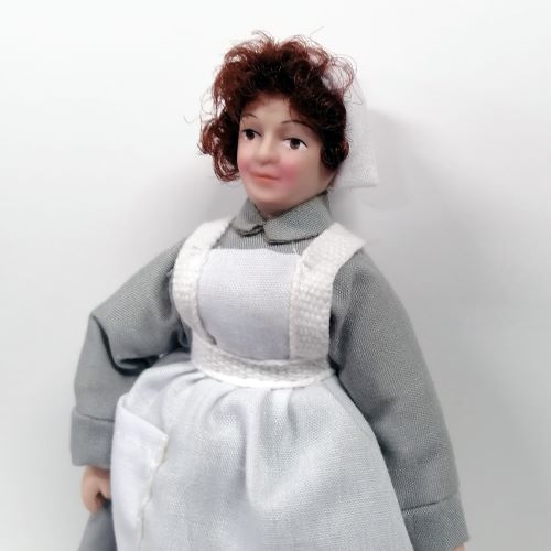 Beryl the cook in apron & grey dress. Doll height 145mm.